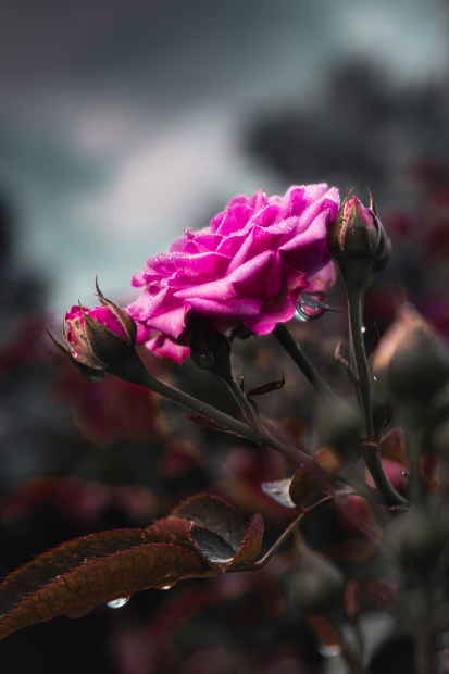 After a night of rain, this pink rose looks skyward for some sunshine.