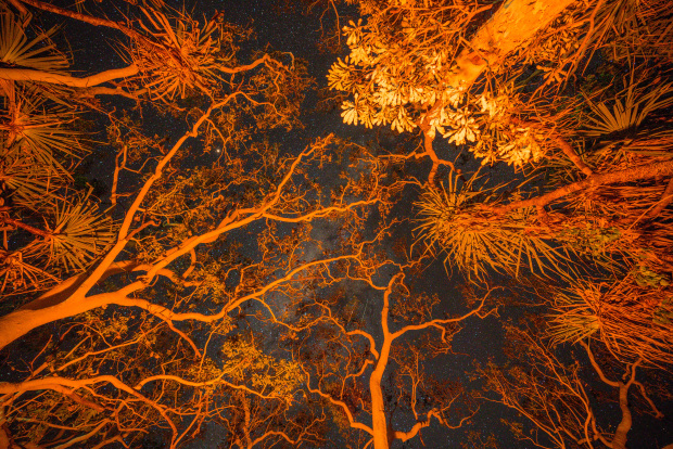 The glow of a campfire onto the underside of the tree canopy in The Kimberly, Australia with the milky way in the background.