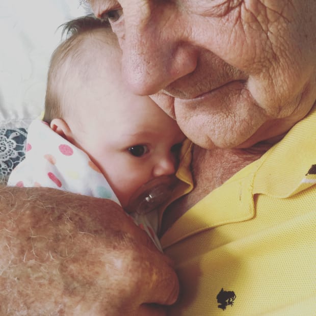 This is my 80 year old father with his 2 month old Granddaughter, Marigold. The aged skin of someone who has lived a thousand stories and the perfect, wrinkle-free skin on someone who has only just begun.
