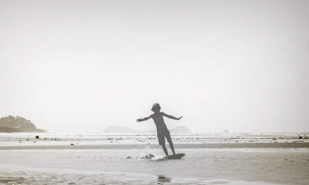 Skim boarding on the water left behind att low tide