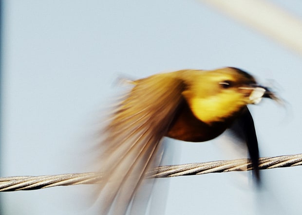 A female sunbird on her way to deliver a spider to her new chicks