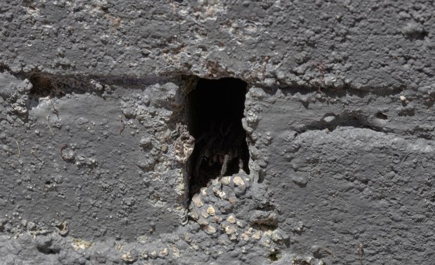 A wolf spider, who has taken up residency in a retaining wall, waits patiently for her next meal.