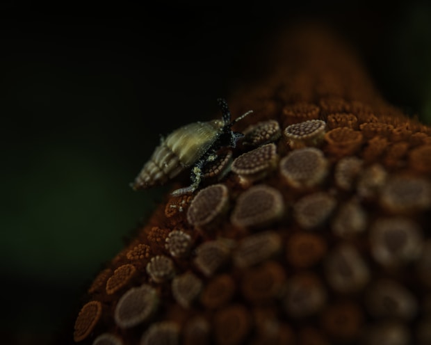 Crab in shell on star fish tentacle. Super macro, out of camera focus. Rapid Bay, South Australia