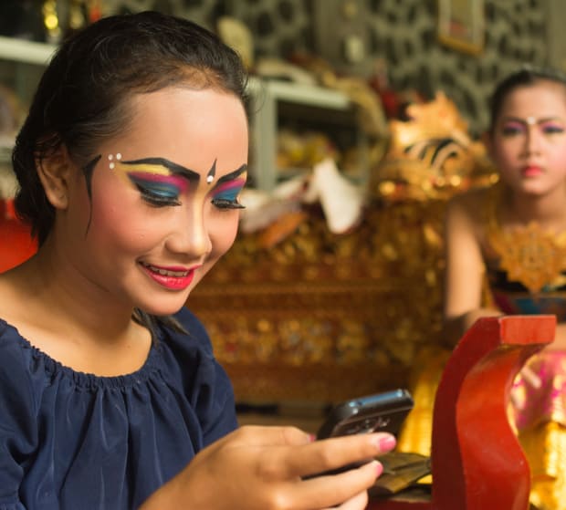 A Balinese dancer waits for the addition of her costume after going through the make-up process