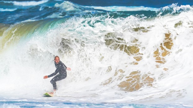 Surfer narrowly rides the sandbank barrels at Nobbys beach, Newcastle.