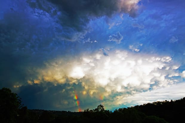 Detail of mamatus cloud at dusk with the beginning of a double rainbow