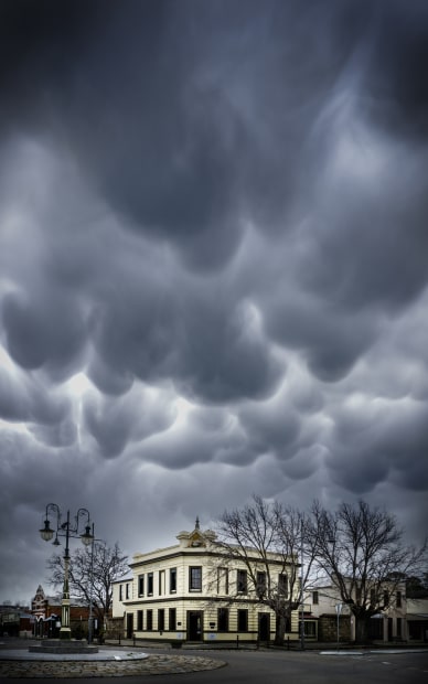 some incredibly impressive mammatus clouds form over the old Gold Bank (now bee Centre) at beautiful Beechworth, Victoria. Taken in August 2019 on a ski trip to Hotham.