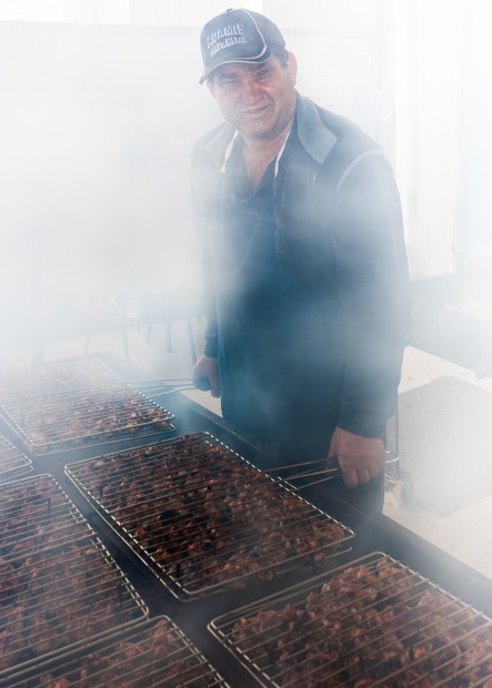The photo captures a candid moment of a chef at a Greek festival in Adelaide. The chef is busy preparing a feast for a large group of people, and the environment is full of smoke from the grills and ovens.