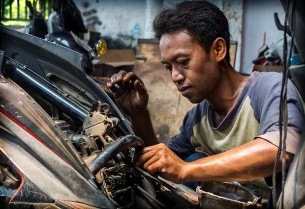 A motor cycle mechanic hard at work in his garage in north Bali