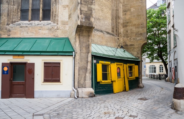 The stone structure is St Stephan's Cathedral in Vienna built in 14th century with aid of compasses and a ruler. The glued on structures are 20th century buildings built in the era of computers.