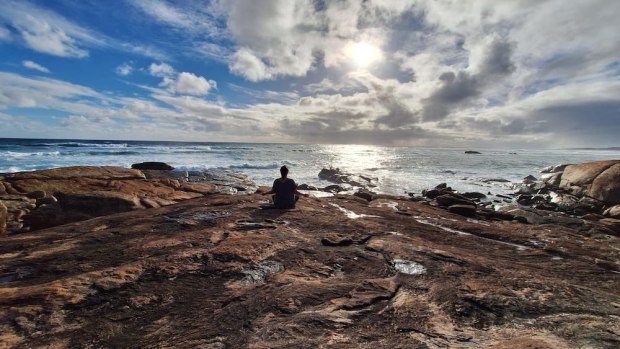 Woman facing the ocean and meditating on the rocks at Red Gate Beach, Western Australia