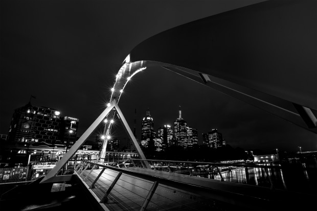 Melbourne skyline taken from the Evan Walker Pedestrian Bridge crossing the Yarra River