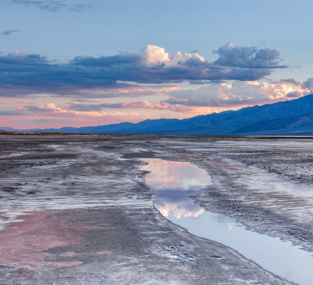 Recent rain provided an opportunity to capture a unique sunset over the Mesquite Salt Flats in Death valley