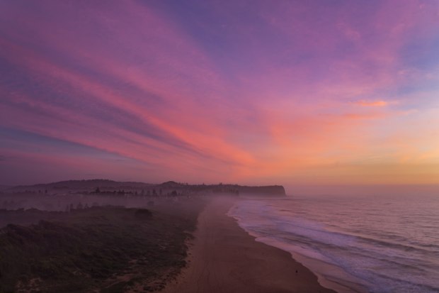 A single person enjoys a beautiful misty pink sunrise looking down Mona Vale beach just north of Sydney.