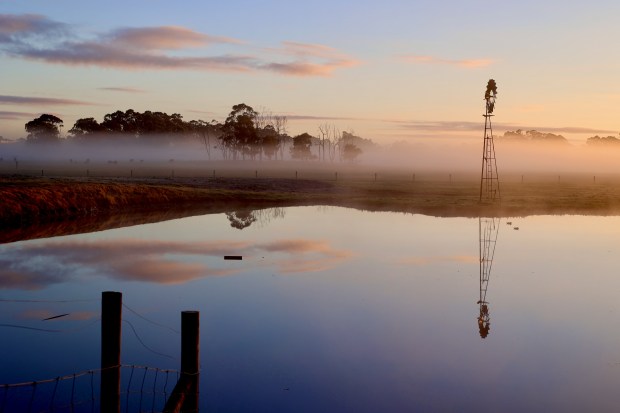 Windmill reflection as the misty fog hovers and the sun rises over the farm dam at Margaret River Western Australia.