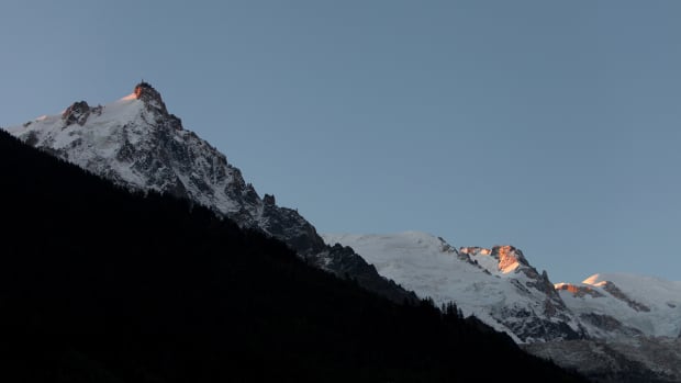 First light hits the Aiguille du Midi and Mont Blanc above Chamonix, France