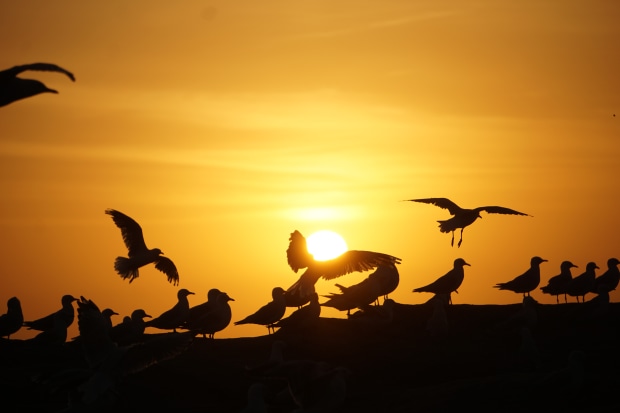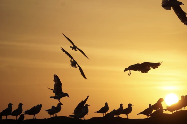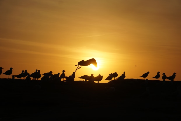 Seagulls standing in front of the sun.