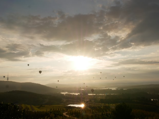 This photo was taken at the arboretum in Canberra during the hot air balloon festival 2026. To the left is Telstra Tower on the peak of Black Mountain