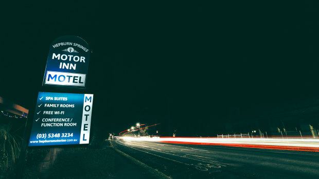 Some light trails by a quiet motor inn.