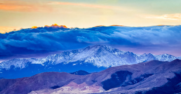 Pikes Peak in Colorado Springs, with a light dusting of snow, the beauty of it is taken away by the destruction of the mountains by the mining pit left by man.