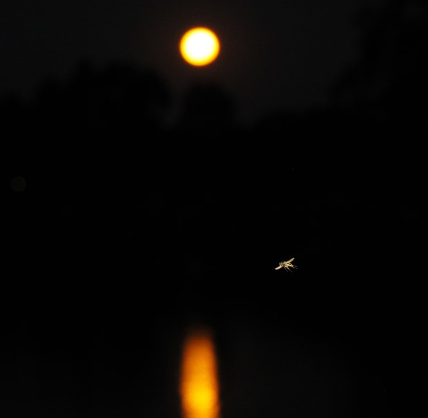 Taking photos of a full, golden moon reflected in the lake, and captured this cheeky mozzie flying past!