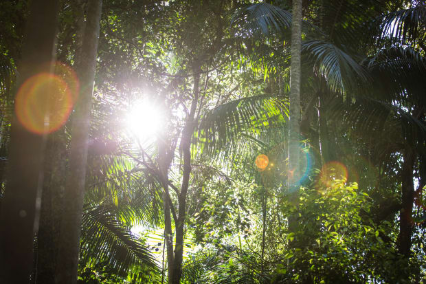 The sun peeks through the canopy of trees as I hiked through the trails of Tambourine Rainforest.