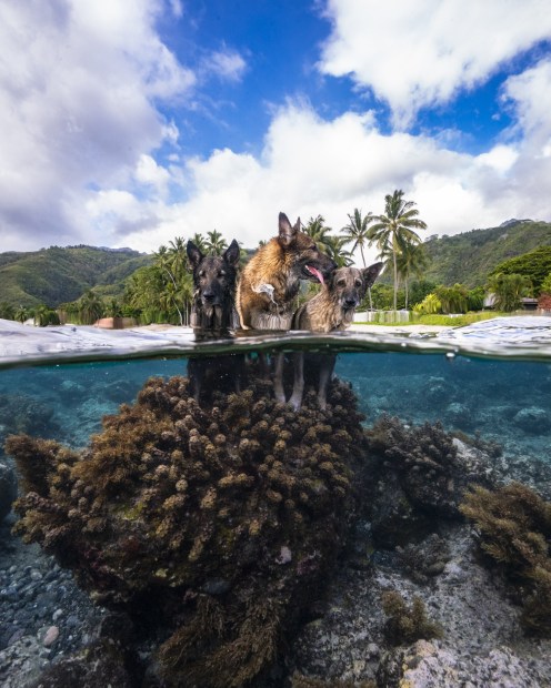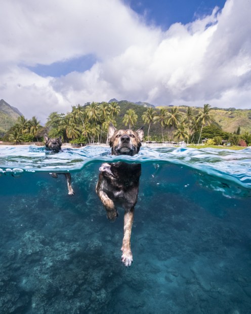 The Musketeers. These 3 French Polynesian dogs redefined the canine race for me. I am an underwater photographer and freediver, I was in French Polynesia trying to capture pictures of Whales and other marine wildlife in one of the bays on the west of Tahiti, a particularly current heavy bay called "Pā'ea". One morning, a calf and its mother were quite close to the break so I decided to fight the currents to try to get from shore past the break to capture the calf. The water was flowing from the lagoon into the bay on slack high tide, a particularly rough morning. The nearest beach with access to this bay is private, available only to the locals that own the surrounding houses, one of which was hosting me. These 3 dogs belonged to one of the locals, and pretty much ruled the private beach where I was staying. They would play with rocks instead of sticks, very tough animals. And they would follow me Everywhere while I was on the beach. But that morning, they followed me deep into the bay, at least 50 metres in. I kept having to swim back to shore to bring them back and unfortunately I missed the calf.. I was too concerned with one of the dogs drowning... Ha. I've never been so wrong in my life. They kept following me in and out of the water, fighting the currents each time, until I stopped worrying.. that day they were determined to not let me dive on my own, following me even where the water was 10-15 metres deep. If they'd get tired at any point, they would rest on the beach for 5 minutes, and come straight back in. I was by myself, concerned because of the murky waters, the currents, the grey sharks.. but I didn't fear anymore once the 3 musketeers embraced me as D'Artagnan. Adding as 4th image just a drone shot of the bay for reference of the currents. Today I only want to tell the story of these musketeers, no other wildlife.
