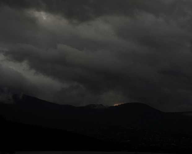 This photograph captures a fleeting moment as the setting sun is suspended between layers of cloud and the silhouette of Mount Wellington. The sun retains its warm orange glow, set against a field of iron-grey tones that heighten the visual contrast. A narrow band of golden light cuts through the darkness, carrying a quiet sense of mystery. It suggests a story in formation, something not yet revealed. In this transient alignment of light and landscape, the image reflects on impermanence, perception, and the subtle tension between clarity and obscurity.