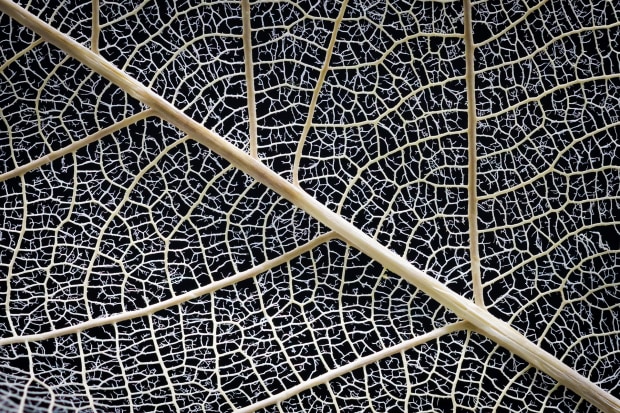 A macro image of the lines and veins of a leaf, with particular emphasis on the placement of the diagonal main line to show symmetry, yet at the same time natures randomness.