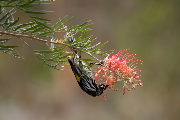 Amber Brentnall, New Holland Honeyeater in grevillia (April Theme: Garden)