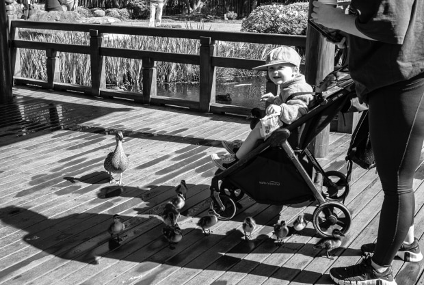 Mum duck and baby ducks walk in to the baby sitting in the trolley pushed by mother