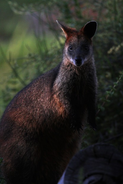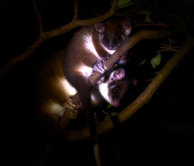Four marsupials captured at different times of the day or night, and under different lighting conditions, including two wallabies in the dawn light, a mother and joey tree kangaroo in the early morning, and a mother and baby ringtail possum photographed at night.