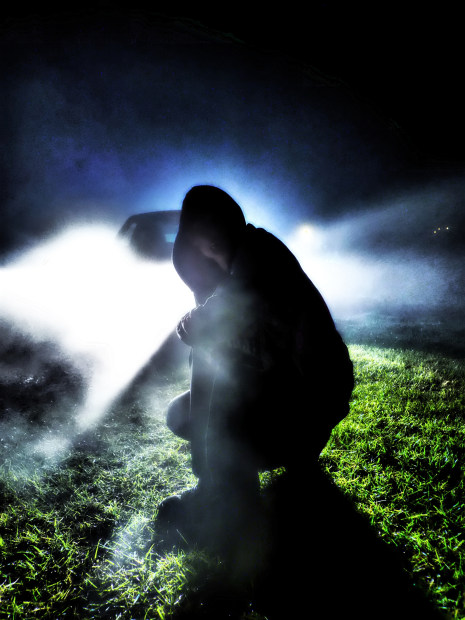 On a freezing cold night photography is the only reason to leave the house. I used my car headlights to highlight the fog and posed in my picture