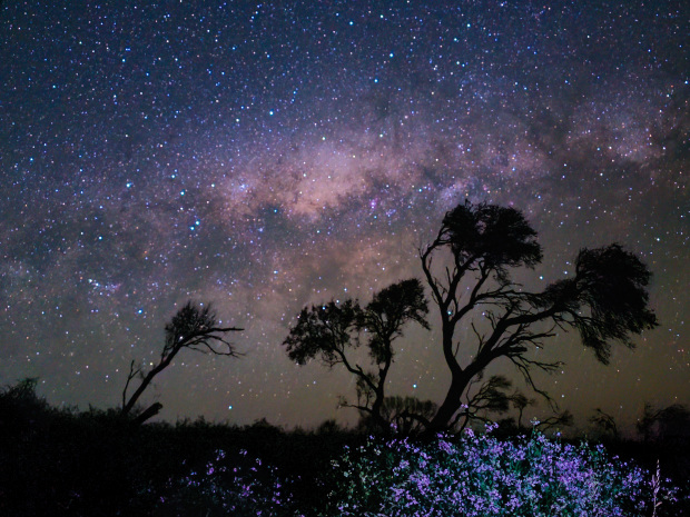 This photo is a night landscape featuring the Milky Way stretching across the sky. In the foreground, there are dark silhouettes of several trees and a field of small purple flowers.