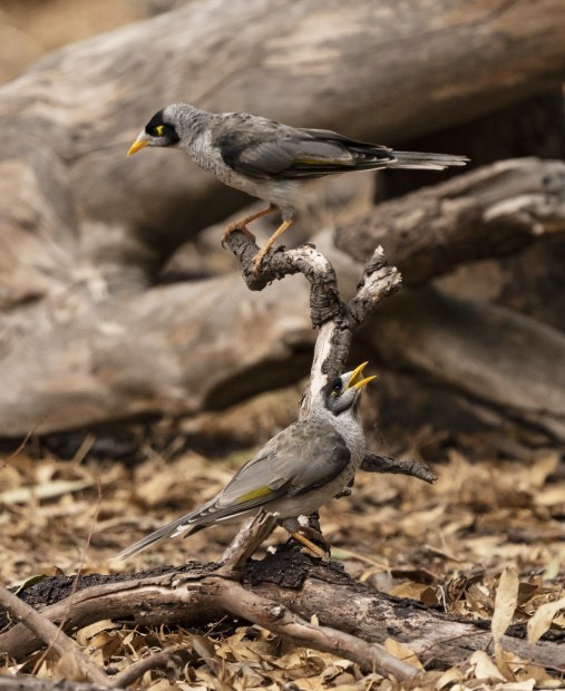 A pair of Noisy MInors foraging for food