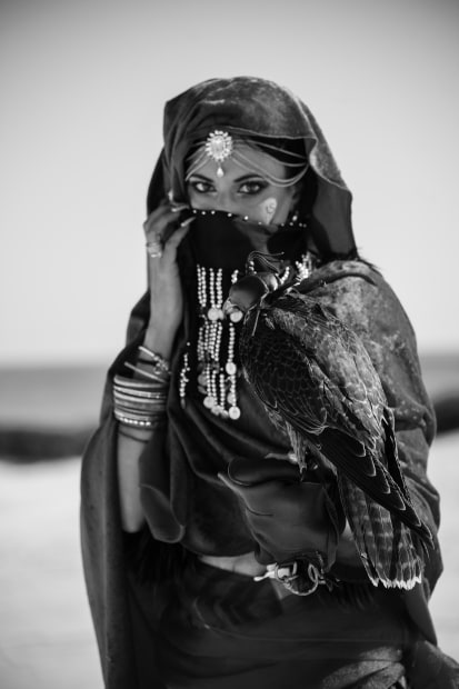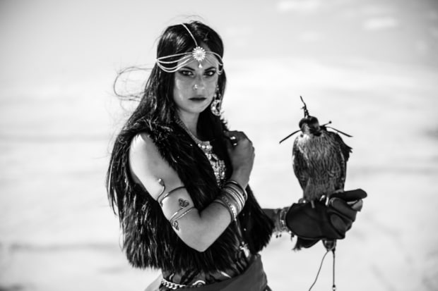 A depiction of a Nomadic princess on the sandy desolate dunes of the north plains with her winged huntress