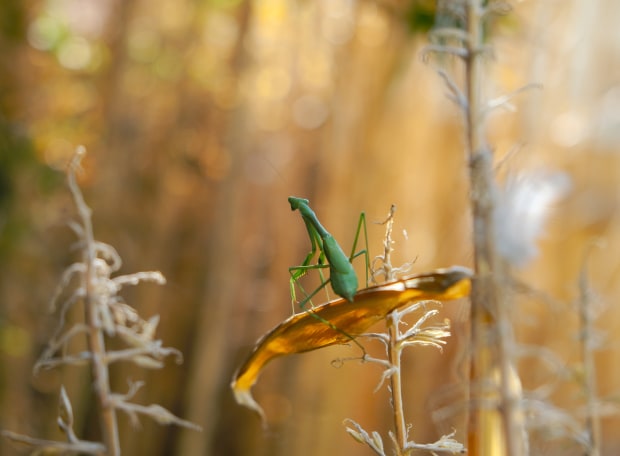 As the summer veggies die off and turn to brown, this mantis is looking out from the past season's corn for a new place to camouflage among the green.