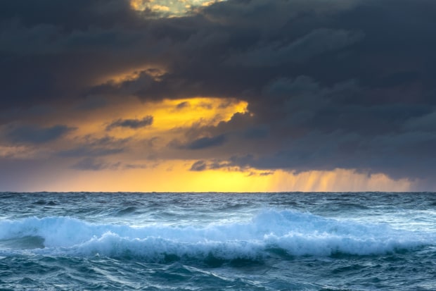 Storm clouds gather offshore as the sun shines through the rain