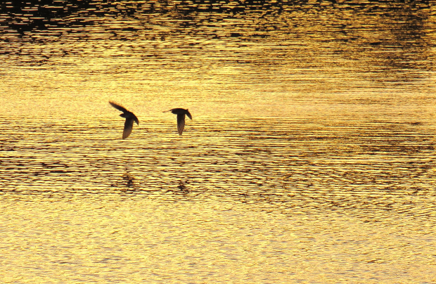 Birds glide over the lake at sunset, such beauty in a simple moment in time.