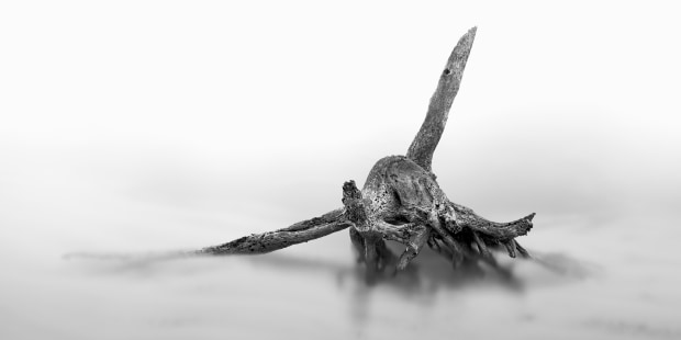 A 3 minute exposure of the remains iof an ol mangrove tree partially in the water.
