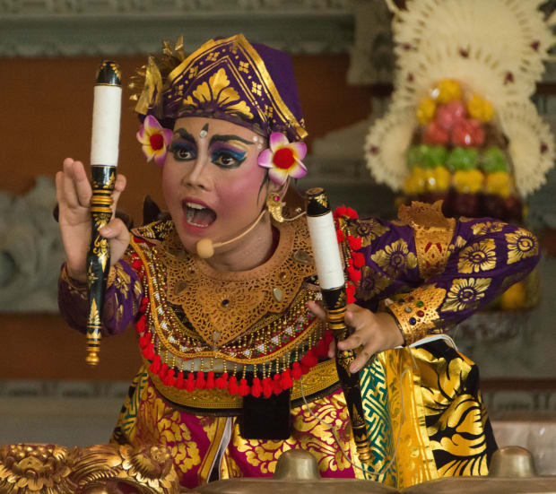 A Balinese girl performs the Pala Wakia dance, which involves high skills in singing, dancing and instrumental performance
