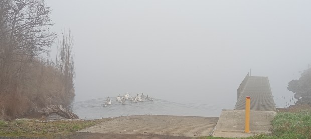 The fog at the lake's boat ramp