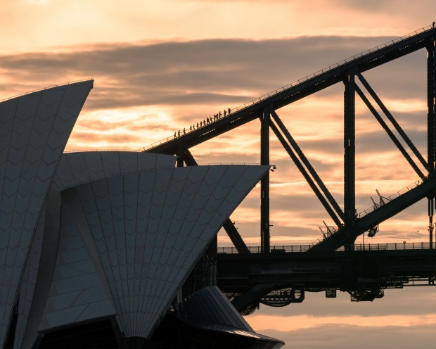 A rather un-usual shot of Sydney Opera House with the Harbour Bridge behind, at sunset