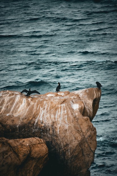 A trio of Great Cormorants perched on top of a lone boulder, facing out towards the sea.