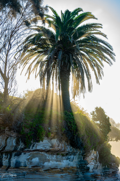 A random aligned moment in time when sea spray, Sun rays and golden hour meet, diffused by a gorgeous palm tree standing overwatch of the ocean.