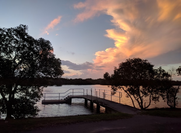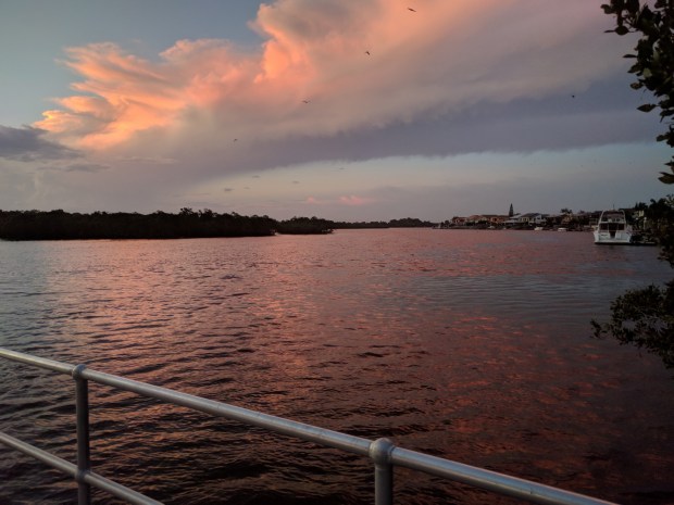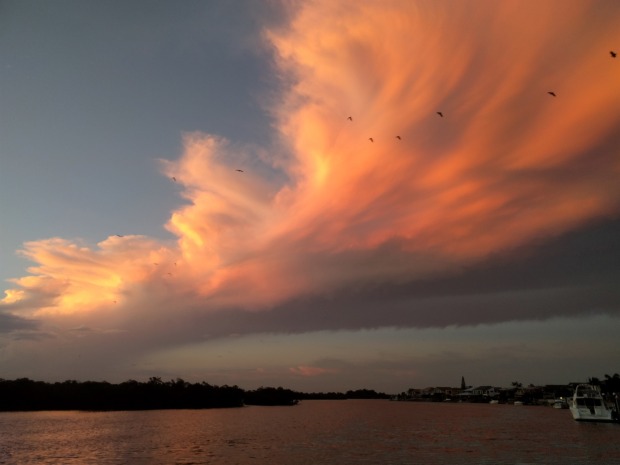 A storm approaching over water. Storm passing a jetty. Sunset colours on the water. Susnet reflecting on the passing storm cloud with bats flying by.