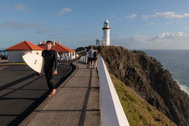 A surfer walks past the lighthouse carrying his board after a surf session on a clear summer day.