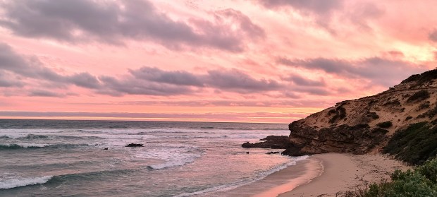 Bathed in the quiet hush of a summer evening, Sorrento Back Beach unfolds in softened pastels—blush pinks and warm oranges dissolving into a cool, grey-tinted sea. The ocean laps the shore with a gentle rhythm, its muted tones reflecting the fading light and the calm between day and night. This moment captures the coast in transition, where colour, motion, and stillness briefly exist in perfect balance.