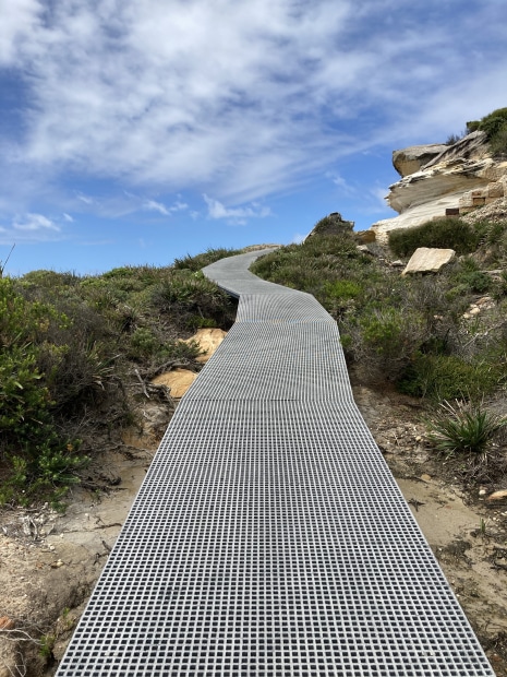 A shot of the coastal track, curving to the right, but appearing to end in nothing.