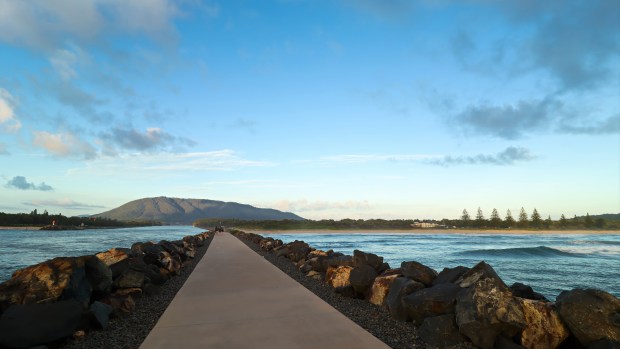 Footpath along the break wall at North Haven Beach at early morning, facing toward North Brother Mountain, NSW, Australia.